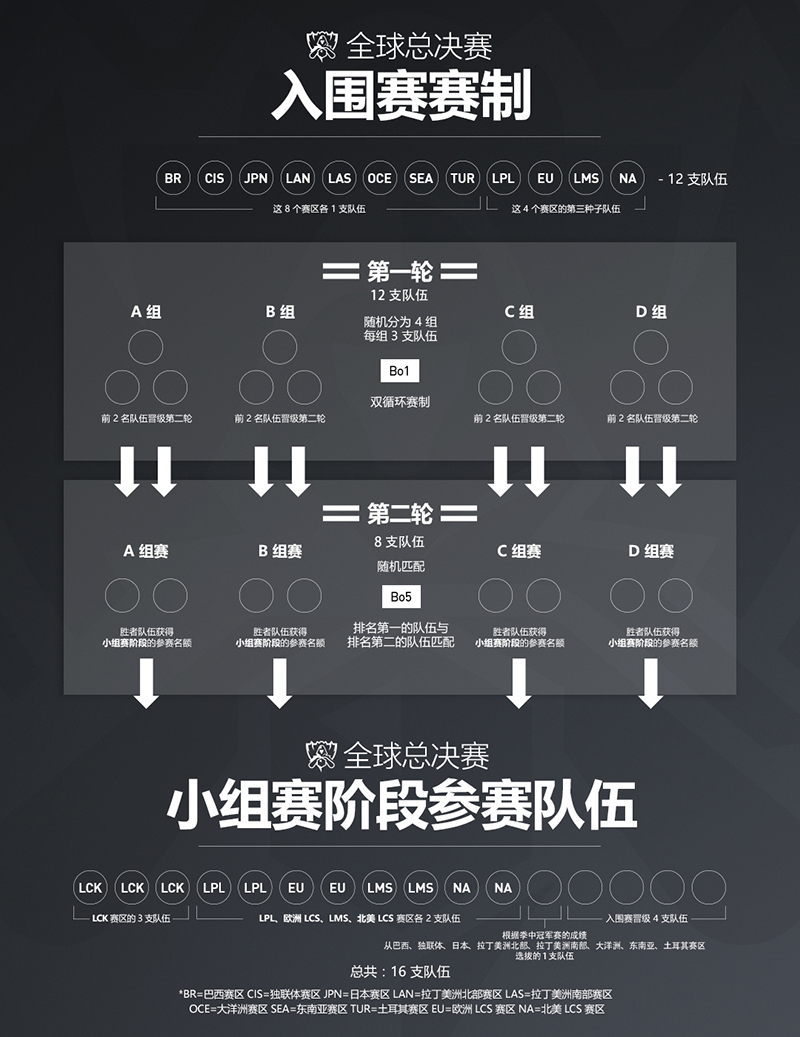 和2017季中冠军赛[2] 同样,现在全球总决赛的小组赛阶段之前,也会先进行入围赛阶段比赛。
