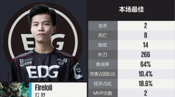 在双方的第一局较量中,前期双方你来我往,都没有占到太大便宜。但中期由于EDG对己方后排保护不足,Rookie利用劫的灵活性多次在团战中切掉对方C位,并依靠单带 为己方打出优势。但比赛进入大后期,IG阵容则显得伤害不足,并且己方兰博难以承担前排重任。在EDG迅速rush掉第三条大龙后,凭借buff优势一波推掉对方基地。