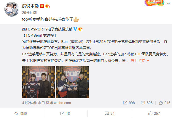 在TOP战队官宣引进Ben之后,解说管泽元直接用两个字形容TOP新赛季阵容,那就是“起飞”!而以“毒奶”著称的管泽元这番话也是吓到了TOP战队,TOP官博和TOP经理都纷纷出来表示“管哥嘴下留情”。