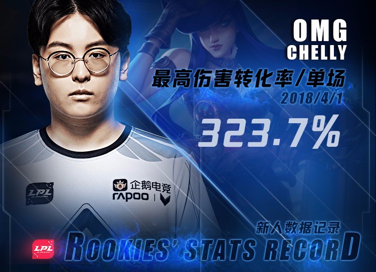 作为OMG的新人ADC,Chelly在4月1日的比赛里,使用女警创下了新秀单场最高伤害转化率的记录:323.7%。