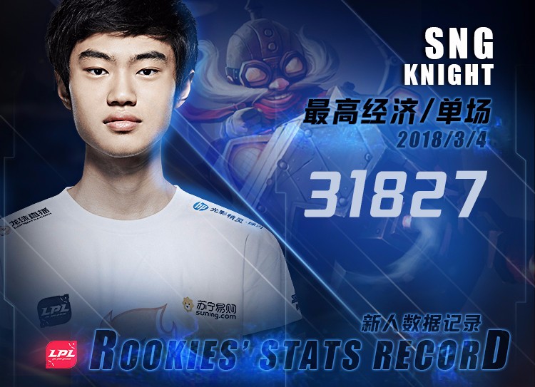 2018年新秀单场最高伤害记录,由当时SNG的中单Knight选手在3月6日对阵WE的比赛中创下。那场耗时接近60分钟的鏖战里,Knight的岩雀打出了76596的伤害,占到全队输出的50%。