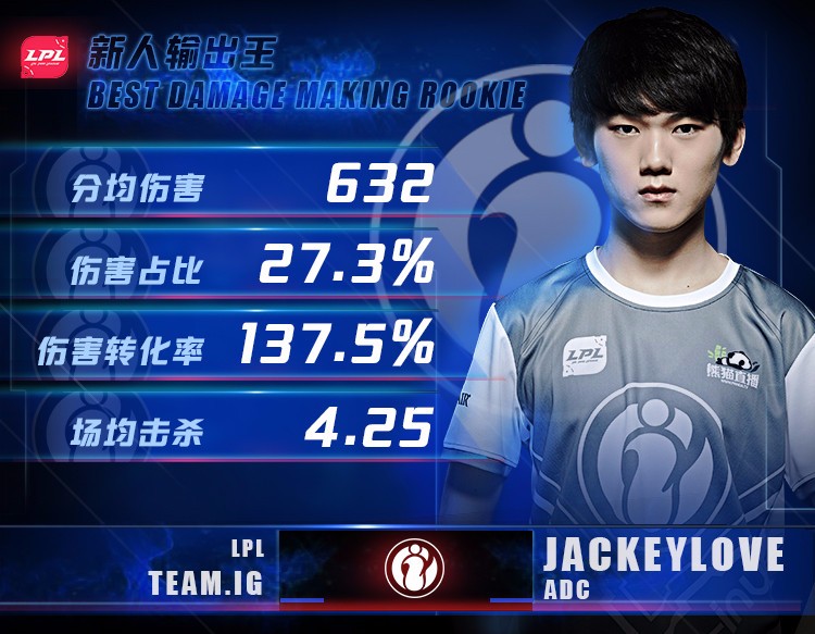ADC毫无疑问是IG的JackeyLove,在2018年的一众新人ADC里,他打出了鹤立鸡群的表现,并且也荣获了官方评选的2018年最佳新人选手荣誉。