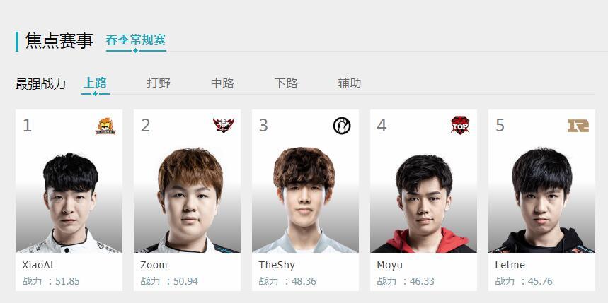 在新赛季的LPL官网上,上单位置的战力榜Zoom排第二,而第三是世界冠军iG战队的上单Theshy。所以除了“卡比兽,”更多的人容易用“国产新星上单”形容Zoom。