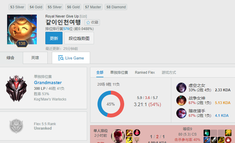 截止小编发文时间,Uzi韩服大号“仁川旅游”新赛季进行了87场比赛,胜率为53%,目前身处LOL韩服大师组300胜点,在最近20场比赛中,Uzi最常使用的三个AD英雄依次是2胜4负的卡莎、2胜2负的希维尔,以及2胜1负的VN,如今Uzi训练赛重拾VN,年前1胜2负的VG战队能否顶住压力?