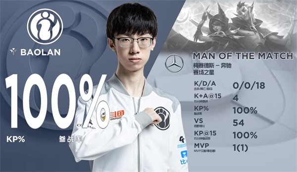 在第一局比赛中,iG辅助选手Baolan拿出了招牌英雄洛,这也是他去年在全球总决赛中发挥出色的英雄。Baolan的洛在这局比赛中有着亮眼表现,100%的参团率并且一次也没有死过,最终Baolan拿下了MVP。最近iG世界冠军皮肤即将发售,解说们也是调侃表示Baolan这是为自己的冠军洛皮肤打广告。