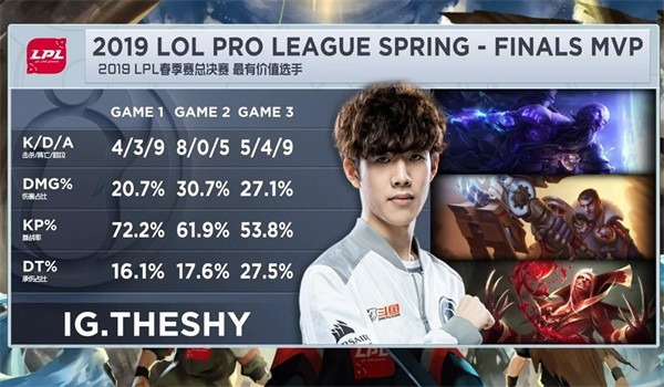 第二局比赛中,TheShy选择了杰斯上单,来对阵Zoom的赛恩。凭着强大的对线能力,他在前期配合Ning取得了击杀,顺利建立了对线优势。而在比赛中期,TheShy成为了JDG的噩梦,尤其他行云流水的操作单杀了imp的韦鲁斯,更是粉碎了JDG的翻盘希望。TheShy三局比赛都打出了统治力,华丽数据拿下这次春决MVP。