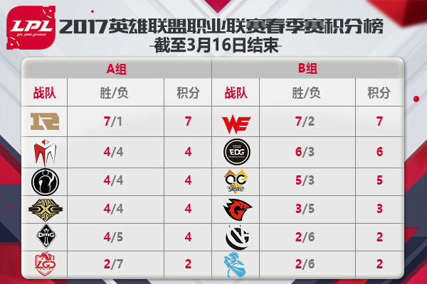 图1:LPL春季赛积分榜3月18日15:00,LPL春季赛第六周焦点战