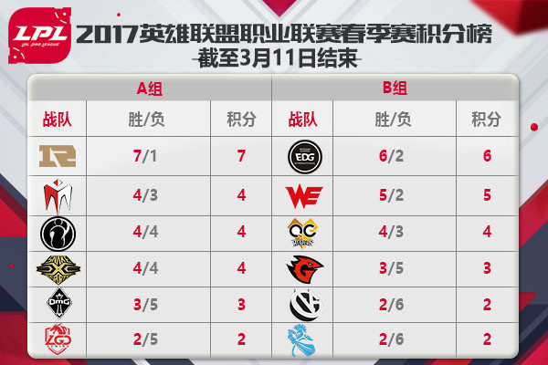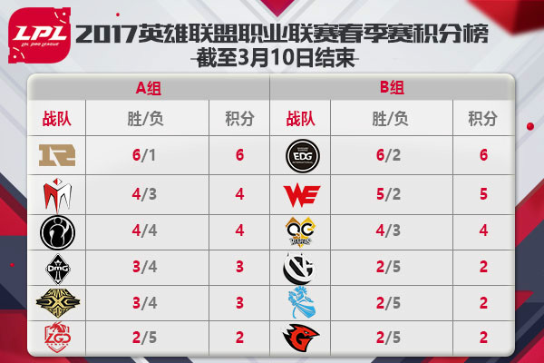 2017年LPL春季赛将近过半,AB两组的胜负关系已经初步显
