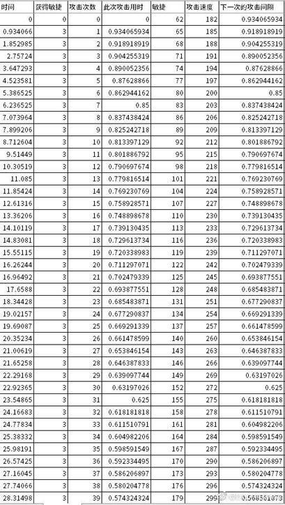 1. 根据攻击速度公式(O网页链接),可以用Excel公式写出当前敏捷与下一次攻击用时之间的关系,再使用Excel的累加公式,便可以得到总敏捷与总时间的关系,如图1。