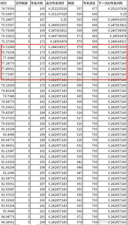 2. 需要特别注意攻击速度到达700后的数据。当攻击速度大于700时,攻击间隔不再变化,所以后面的攻击速度都应改为700,如图2。