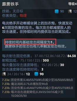 持续时间内,自身基础攻击间隔将变为1,理论上来说满攻速时攻击间隔为0.14(只开一个霹雳铁手而没有装备时并不能达到)