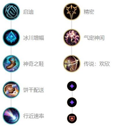 主系选择启迪系的冰川增幅,提高风筝能力,神奇之鞋剩下经济做其他装备,饼干配送提高对线的续航能力,行进速率配合冰川增幅增加移速。副系选择精密系的气定神闲和欢欣,提高法力值与攻速,属性符文选择攻击力+攻击力+护甲。